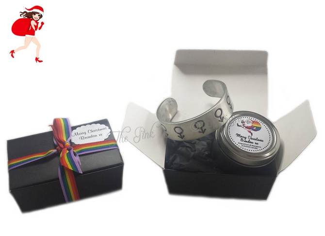 Gift set comprising a personalised candle-mini in a tin with a personalised label and a heavy pewter gay symbol cuff style bracelet. The perfect gift idea for gay friends or partners!
